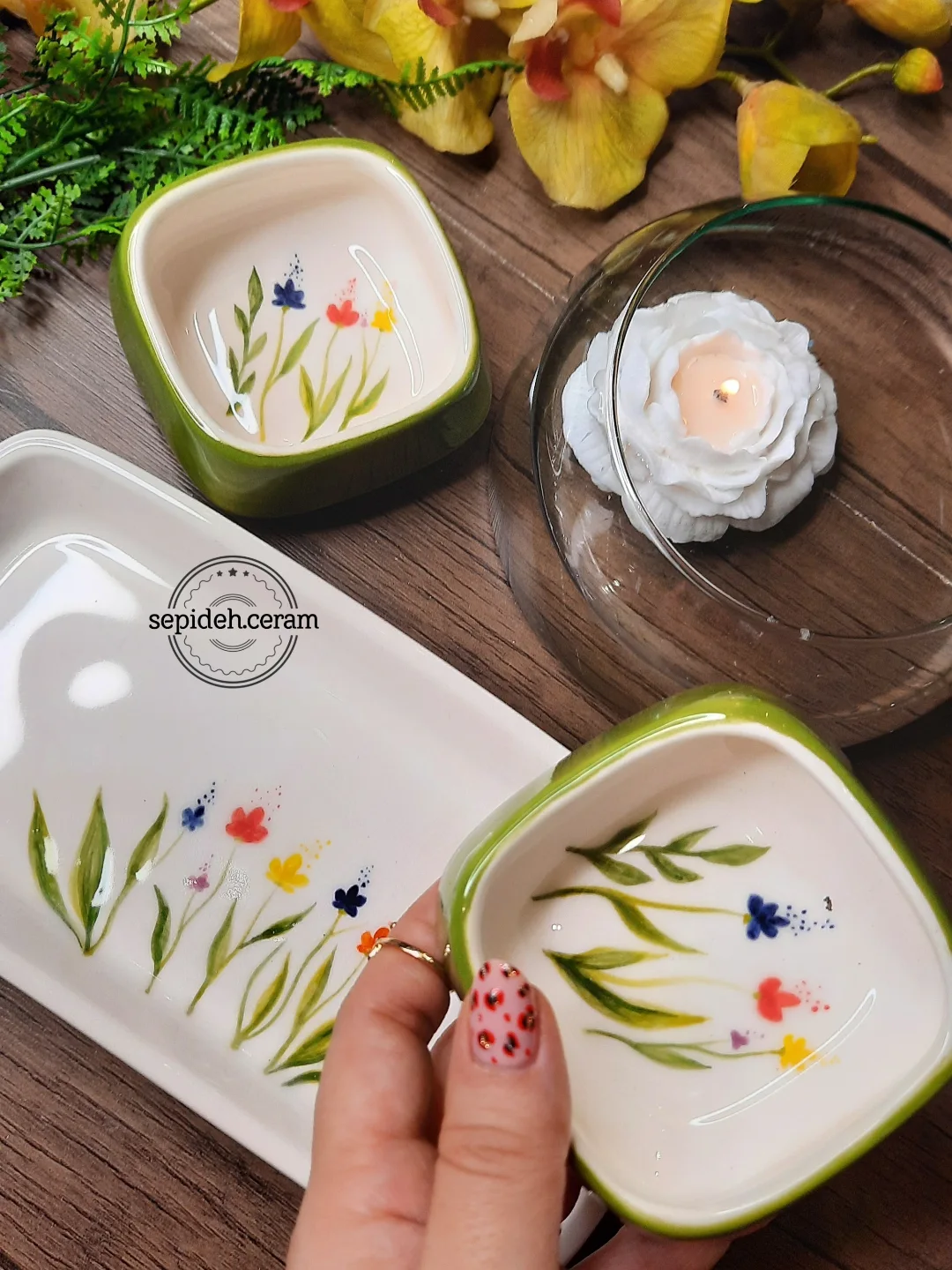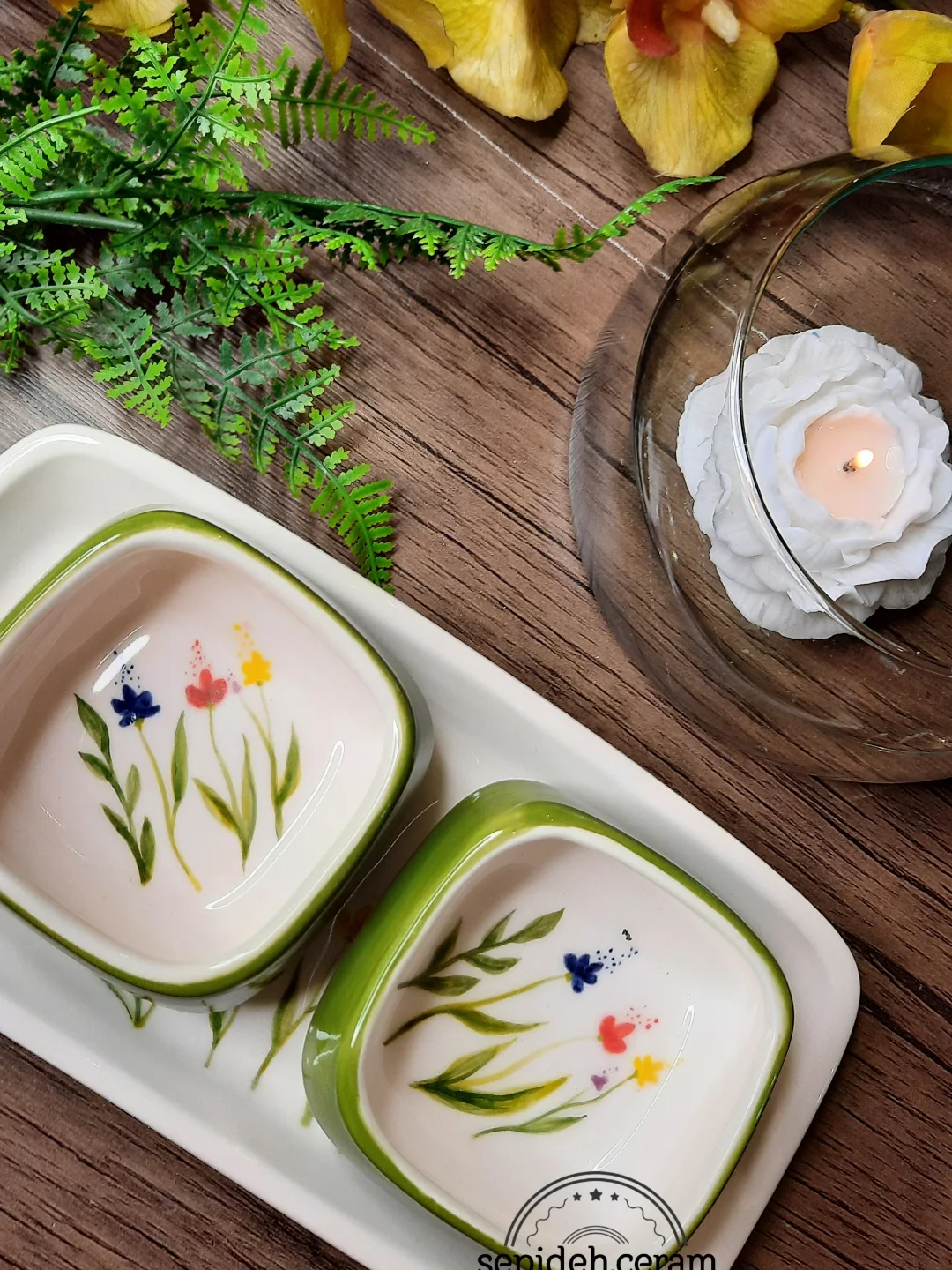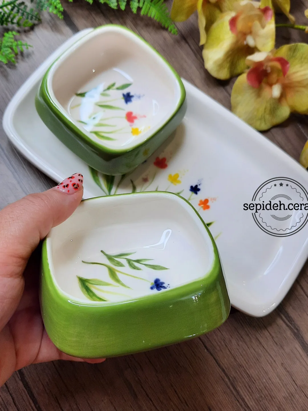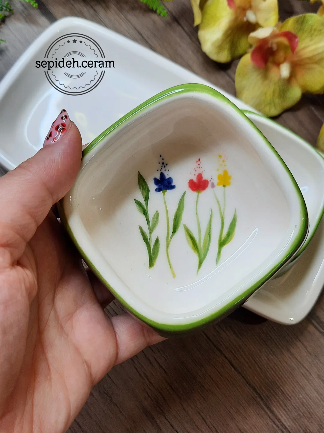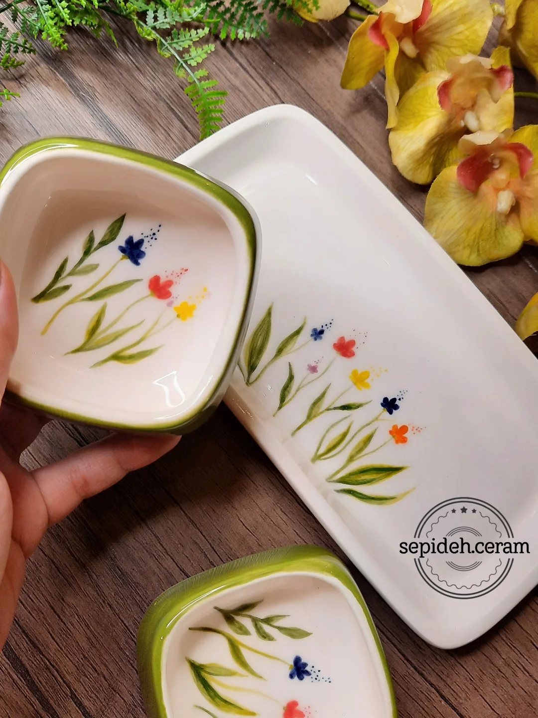 این نیم ست جذاب برای سرو مربا و پنیر، یا میوه های تابستونی و مزه ها قابل استفاده هست و نقاشی زیباش کارِ دست هست.